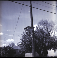 KEL 885 002 Mrs. Alfred Blandford shows Gary McKinley an unusual telephone at a party for students of the Idaho State Deaf and Blind School held at the home of Mrs. E. W. McRoberts by the Delta Gamma Alumnae Association. Mr. McKinley sits in a recliner and holds the receiver of the telephone while Mrs. Blandford sits on a couch and adjusts a setting on the cradle. The telephone sits on a small round end table between the couch and recliner. Also on the end table is an ash tray and a lamp. Behind them is a large curtained window, and the backyard is seen through the window.