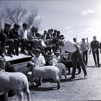 KEL 879 FFA members display their sheep at the East Magic Valley FFA District Livestock Contest held at the Jim Brooks Ranch in Hazelton. Jim Olsen walks down the line, explaining the proper way to judge sheep. A large group of FFA members sit on a sloped pen roof watching the judging.