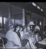 KEL 883 Listening intently to the program at the party at the home of Mrs. E. W. McRoberts are, from left to right, Mrs. A. J. Peavey, Linda Warick, Beckie Kincaid, Mrs. Ray Lincoln, and Mrs. Cecil Jones. Linda is a junior at the Idaho State Deaf and Blind School, and Beckie is a sophomore. Both were honorees at the party, held for students of the Idaho State Deaf and Blind School by the Twin Falls Delta Gamma Alumnae Association. The four women sit on a couch, and in front of the couch is a coffee table covered in magazines, and to the side of the couch is an end table with a lamp on it and a recliner. Some other attendees are seen in the background.