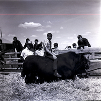KEL 877 A boy sits on top of a bull at the East Magic Valley FFA District Livestock Contest held at the Jim Brooks Ranch in Hazelton. Two men dressed in cowboy hats stand beside him. Behind him is a fence, and several FFA members are propped up on the fence, looking at the bull. A barn is in the background.