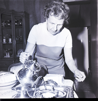 KEL 885 Mrs. E. W. McRoberts pours tea from a silver teapot into some tea cups on a silver platter at a party for students of the Idaho State Deaf and Blind School held at her residence by the Delta Gamma Alumnae Association. A cabinet filled with glassware is against the back dining room wall.