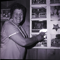 KEL 981 Mrs. Merl Leonard, superintendent of needlework for the Twin Falls County Fair, stands beside a wall. She is wearing a blouse with a name tag pinned onto the front.