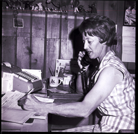 KEL 976 Mrs. Tom Shouse, wife of the fair secretary-manager, takes orders for reserve seat tickets and enters exhibits for the fair. She is seated at a desk and holds a phone in one hand while writing with the other. On top of the desk is a typewriter and a coffee cup. A shelf is above the desk, and several figurines decorate the shelf. A framed picture hangs on the wall, and a paper is tacked up to the wall below it.