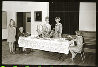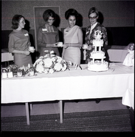 KEL 775 Two women sit at the ends of a table, helping themselves to punch at a Panhellenic Tea for high school seniors, hosted by nine sororities from the University of Idaho at the Bishop Rhea Auditorium. The table is covered in a lace tablecloth, and on it are cups, plates, bowls of punch, platters of cookies, a bouquet of flowers, and a candle holder. Two girls stand behind the table, and another stands to the side. Behind the table is a stage, and hanging on the back wall is a photograph of a man.