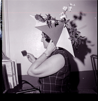 KEL 787 Ola Cannon wears a hat shaped like an umbrella and decorated in plastic flowers. The hat was homemade for Easter and worn during the Ladies of the Elks hat parade.