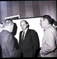 KEL 778 Water is discussed by a Salmon Tract farmer and state officials during a recent water forecast meeting at Hollister. From left to right are Clarence Hedrick, Soil Conservation Service unit conservationist; Morlan Nelson, Soil Conservation Service state snow survey leader; Keith Higginson, state reclamation engineer; and Donald F. McGregor, Salmon Tract farmer. Another man stands behind the group, near a projector screen.