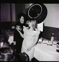 KEL 774 From left to right, Donna Ott and Judy Carver look over a display of car supplies given away as special prizes to guests at a party held for Magic Valley engaged girls at the Rogerson Hotel. The prizes were courtesy of the Twin Fails Bank and Trust Co., the Blue Lakes North Mobil Service and the Welcome Wagon hostesses. Miss Carver holds a can of oil. On the display table behind the women are boxes of oil filters and radiator hoses. A tire hangs on the wall behind them.