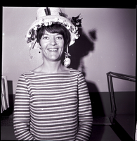KEL 783 Carol Serpa wears a wide-brimmed hat covered in plastic flowers, a crown, a kaleidoscope, and a butterfly. The hat was homemade for Easter and worn during the Ladies of the Elks hat parade.