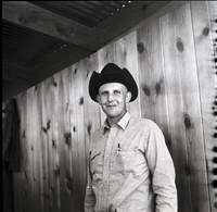 KEL 780 Robert Loucks, new county agent for Camas County, stands beside a wooden wall. He is dressed in a button-up shirt with a pen in the front pocket and a cowboy hat. A coat hangs from a peg on the wall behind him.