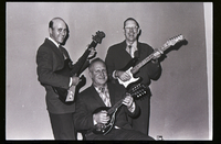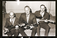 KEL 705 Three men dressed in suits and bolo ties sit on a carpeted step and hold their guitars at the Country Music Jamboree appreciation dinner held at the Twin Falls Moose Hall.