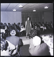 KEL 707 Mrs. Gilbert DeKlotz Jr. models a striped dress at a fashion show during the Filer Kiwanis Club Ladies' Night held at the Twin Falls Holiday Inn. She is stopped on a runway and several people sit in chairs at the side of the room, watching.
