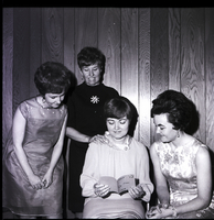 KEL 699 Officers for the Haus Frau Home Demonstration Club were installed during a recent dinner meeting at Griggs Cafe. From left to right are Mrs. Denis Kirsch, president; Mrs. Fred Webb, vice president; Mrs. Gerald Devlin, secretary; and Mrs. Alice Reed, Twin Falls County home extension agent. Mrs. Devlin is seated in a chair looking at a card that reads "Haus Frau 1968" on the front. Mrs. Kirsch and Mrs. Webb stand to her left, bending over to look. Mrs. Reed is seated to her right, looking over at the card. They are all wearing dresses.