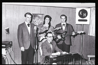 KEL 703 Members of the King's Harvesters band perform at the Country Music Jamboree appreciation dinner held at the Twin Falls Moose Hall. Jim Winkle, guest vocalist with the group, stands behind a microphone. A man with the group plays a keyboard, and another man and a woman are playing guitars. Some musical equipment sits in one corner, while a stand reading "K H" stands in the other corner. On the wall behind them is a picture of a shepherd leading sheep.