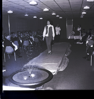 KEL 711 Mrs. Robert Blastock Jr. models a turtleneck and pants at a fashion show during the Filer Kiwanis Club Ladies' Night held at the Twin Falls Holiday Inn. She walks down a runway with a fountain at the end. Several people sit in chairs at the side of the room, watching. At the back of the room is a table covered in a white tablecloth with a bouquet of flowers on top, and Mrs. Morris Carlson, the narrator of the event, stands behind it.