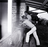 KEL 653 Two men play a shooting game on the Midway at the Twin Falls County Fair. A sign on the wall reads "Mow Em Down Machine Guns, 100 Shots, All Reds Must Be Shot Out." The man in the foreground is wearing a cowboy hat and hunched over with the rifle in his hand. Groups of people browse the Midway booths in the background.