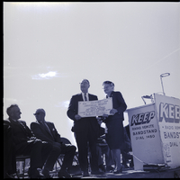 KEL 657 Dan Cavanagh, pioneer builder and contractor for the Hansen suspension bridge, holds up a sign that reads "1919 - 1966 Hansen Memorial Bridge, Dedicated to Lawrence Hansen and John F. Hansen, Pioneer Builders in the Magic Valley. Given by Twin Falls County Centennial Committee" at the Hansen Bridge dedication. Anna Hansen Hayes stands beside him, dressed in a jacket, skirt, and hat. In front of them is a podium that reads "KEEP Radio Remote Bandstand Dial 1450." Several men wearing suits and ties sit in folding chairs on the stage behind them.