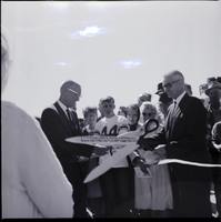 KEL 658 Cutting the ribbon to open the new Hansen Bridge on State Highway 50, north of Hansen, are from left to right, Willard Lattimer, chairman of the Jerome County Commission, and Morris Carlson, chairman of the Twin Falls County Commission. They are wearing suits and ties hold pairs of large scissors that read "S-2741(4)&(6) - Hansen Bridge and Approaches, Opened: Sept. 17, 1966 - Cost: $1,411,100.00." A crowd of men and women have gathered to watch.