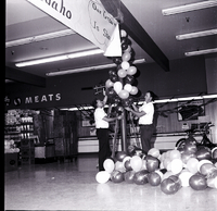 KEL 664 From left to right, Dick Anderson, merchandiser, and Ted Gardner, stocker, hang up a string of balloons on the side of a banner for Safeway's grand opening. The visible part of the banner reads "Idaho, Our Grown is Shown." Behind the men is a ladder, and at their feet is a pile of balloons. The deli section can be seen in the background under a large sign reading "Meats," and streamers hang over the deli counter.