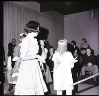 KEL 663 Three queens for Job's Daughters, dressed in their uniforms, stand behind a large arrangement of flowers during the Reception of the Flowers at the 99th annual Communication of the Grand Lodge of Idaho, held at the Twin Falls Masonic Temple. The center girl is Connie Van Ostran. To the left a man is seen behind a large floral display, and two the right women in black dresses hold bouquets. Attendees are seen seated around the sides of the room and up on the mezzanine.