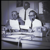 KEL 589 From left to right, Twin Falls County Commissioners Morris W. Carlson, Heber J. Loughmiller, and Maurice V. Klaas look over an accident survey put out by the extension service. On the desk in front of them is an open binder, two telephones, and a name plate reading "Morris W. Carlson." A framed picture of President John F. Kennedy hangs on the back wall. A tree is visible through a window in the wall behind the desk.