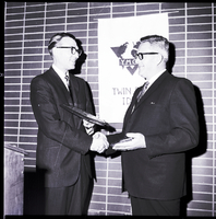 KEL 582 Curtis Eaton, left, chairman of trustees of the White estate, which provided money for the new YMCA building, presents Bill Pressey with the Evangeline White award plaque at the YMCA. They are both dressed in suits and ties. On the wall behind them is a poster reading "YMCA Twin Falls, Idaho." A podium is to the left.