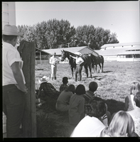 KEL 936 Mrs. Roy Jesser gives a presentation on horse grooming for a group of children at Horse Achievement Day. She stands beside a horse, holding his bridle, dressed in a cowboy hat and jeans. A young man in riding clothes and a cap stands on the other side of the horse, petting his nose. Another horse stands a few feet behind them in the corral. Several children sit on the sidelines watching, and one is leaning against a fence post. Some stables and barns are visible in the background.